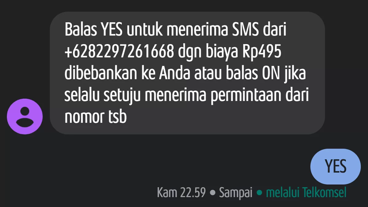 Kembali ke soal SMS. Tempo hari yang nyaris sekali pukul sebelas malam menerima sebuah SMS atau pesan singkat. Nomor pengirimnya 88771, yang isinya: “Balas YES untuk menerima SMS dari +6282297261668 dgn biaya Rp495 dibebankan ke Anda atau balas ON jika selalu setuju menerima permintaan dari nomor tsb”.