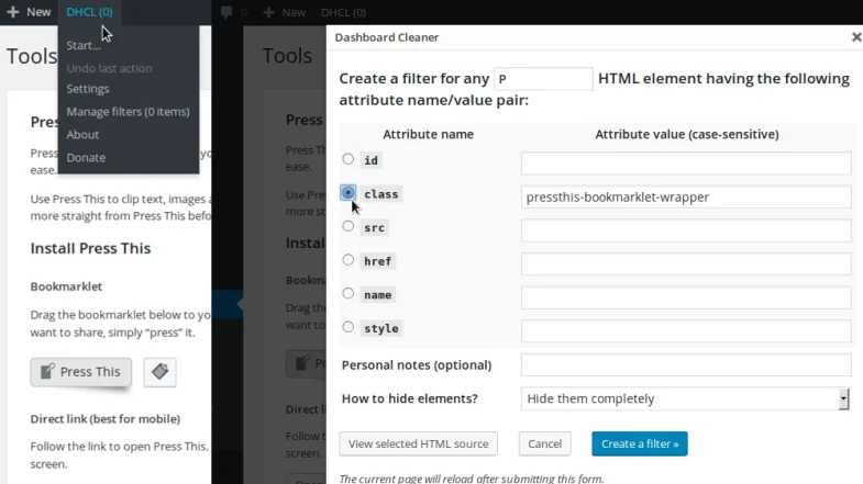 Berikut dapat di unduh/download adalah berkas terjemahan Bahasa Indonesia plugin WordPress Dashboard Cleaner versi 1.1.4. Plugin Dashboard Cleaner ini memungkinkan kita menyembunyikan elemen HTML dari dasbor admin WordPress seperti banner yang mengganggu, iklan yang tidak diinginkan dan gangguan lainnya, dan pada dasarnya apa pun yang kita inginkan. Ini berfungsi seperti DOM inspector: cukup arahkan tetikus dan klik pada elemen HTML yang ingin disembunyikan, pilih dari beberapa opsi yang ada, dan hilang!