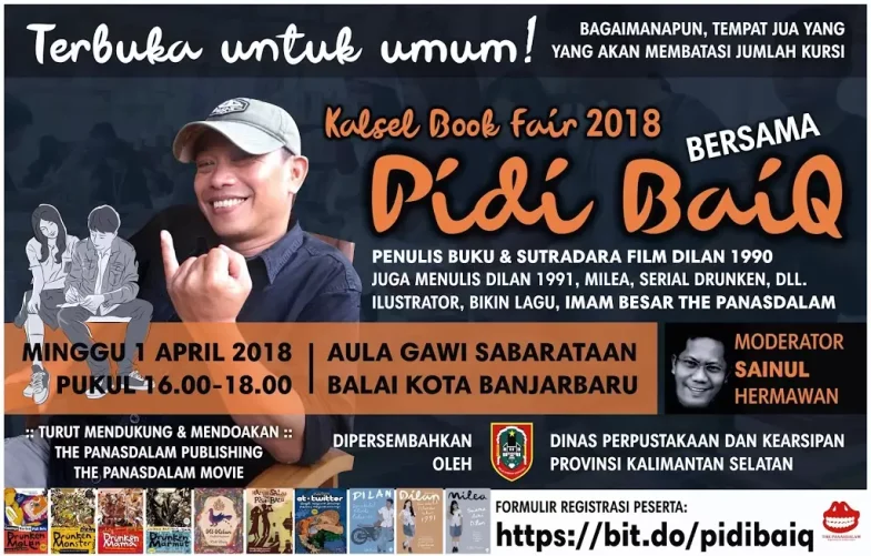 PIDI BAIQ, Imam Besar The Panasdalam, yang salah satu karyanya akhir-akhir ini menyita perhatian penikmat film tanah air yakni film Dilan 1990 yang merupakan sebuah adaptasi dari novel Dilan, dia adalah Dilanku Tahun 1990 karya Pidi Baiq juga, akan berhadir di Kota Banjarbaru dalam rangka Kalsel Book Fair 2018.