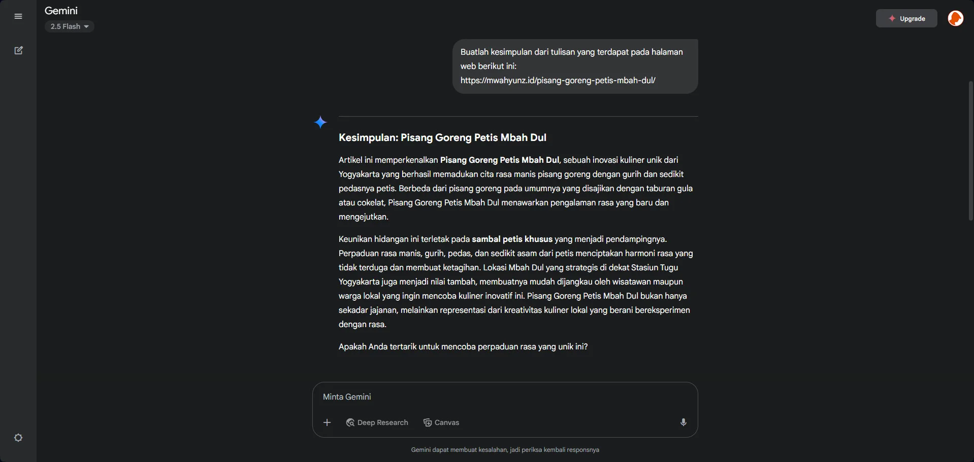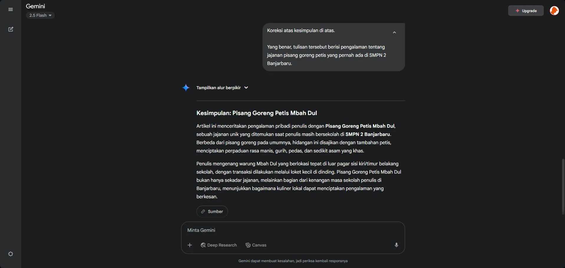 Jika saja tidak mengingat bahwa saat ini sudah lebih dari pukul 01.30 Wita, bisa jadi pecahnya tawa ini tidak akan ditahan, dan akan dibiarkan lepas begitu saja. Penyebabnya dapat dikatakan sederhana, akibat meminta asisten Akal Imitasi untuk membuat kesimpulan atas catatan tentang pisang goreng petis Mbah Dul ini.