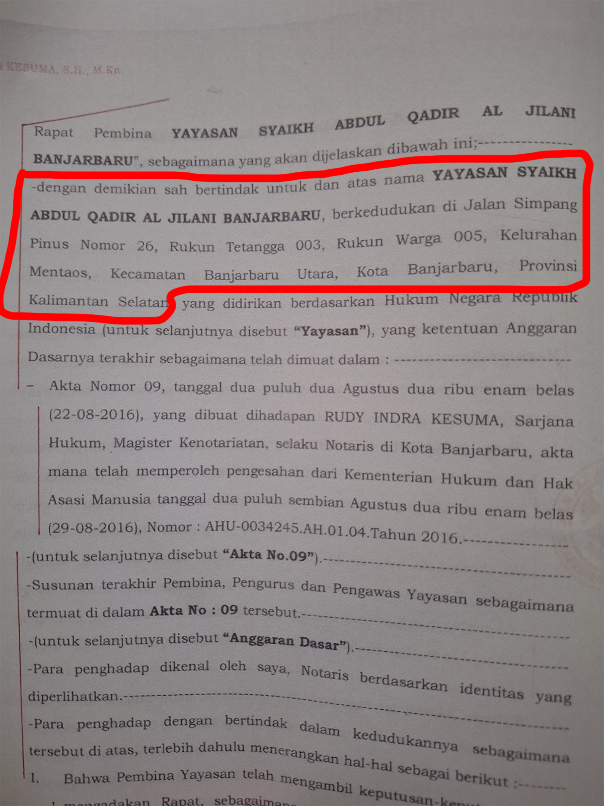 Dokumen pertama, yakni Akta Yayasan, disebutkan dalam akta tersebut bahwa Yayasan Abdul Qadir Al Jilani Banjarbaru berkedudukan di Jalan Simpang Pinus No. 26 RT.003 RW.005 Kelurahan Mentaos, Kecamatan Banjarbaru Utara. Yayasan ini badan hukum yang menaungi Pesantren AQJ tersebut. ( Lihat dokumen akta📄).