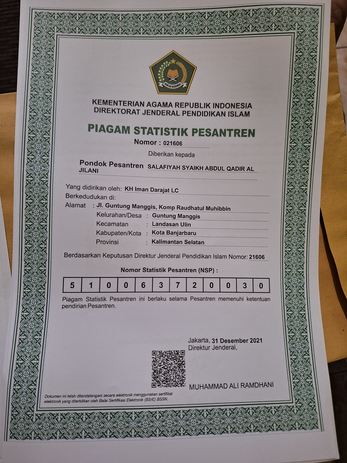 Dokumen kedua, Piagam Statistik Pesantren (PSP). Dokumen ini adalah sebuah tanda daftar keberadaan Pesantren yang sedikitnya memuat nama, pendiri, alamat pesantren, dan Nomor Statistik Pesantren (NSP). Dokumen ini wajib dimiliki oleh pesantren. AQJ memiliki NSP 510063720030 tertanggal 31 Desember 2021. [ Lihat dokumen PSP 📄].