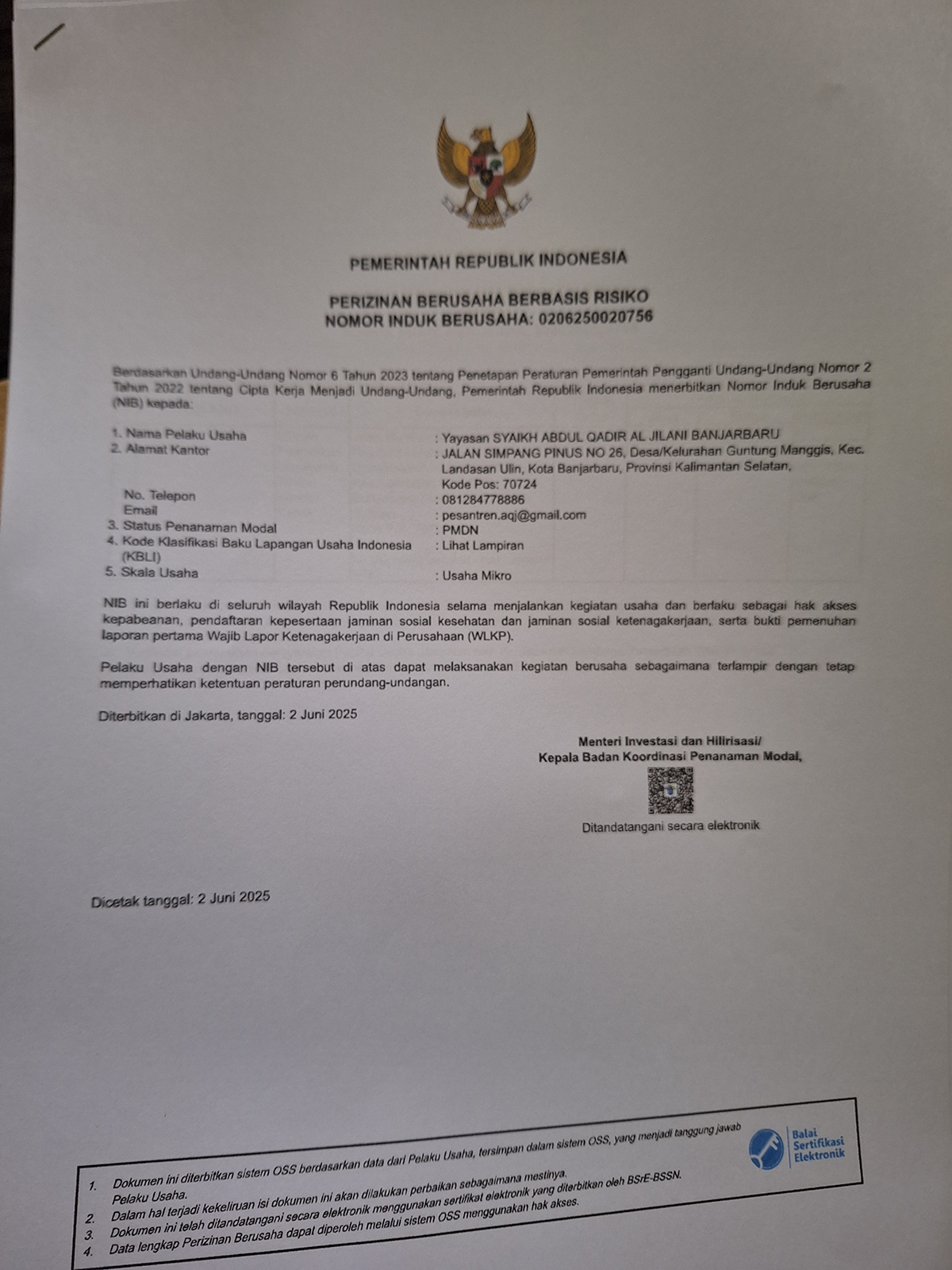Dokumen ketiga, Perizinan Berusaha Berbasis Risiko dengan Nomor Induk Berusaha 0206250020756 dengan identitas nama pelaku usaha yang tercantum adalah Yayasan Syaikh Abdul Qadir Al Jilani Banjarbaru. [ Lihat dokumen NIB 📄].