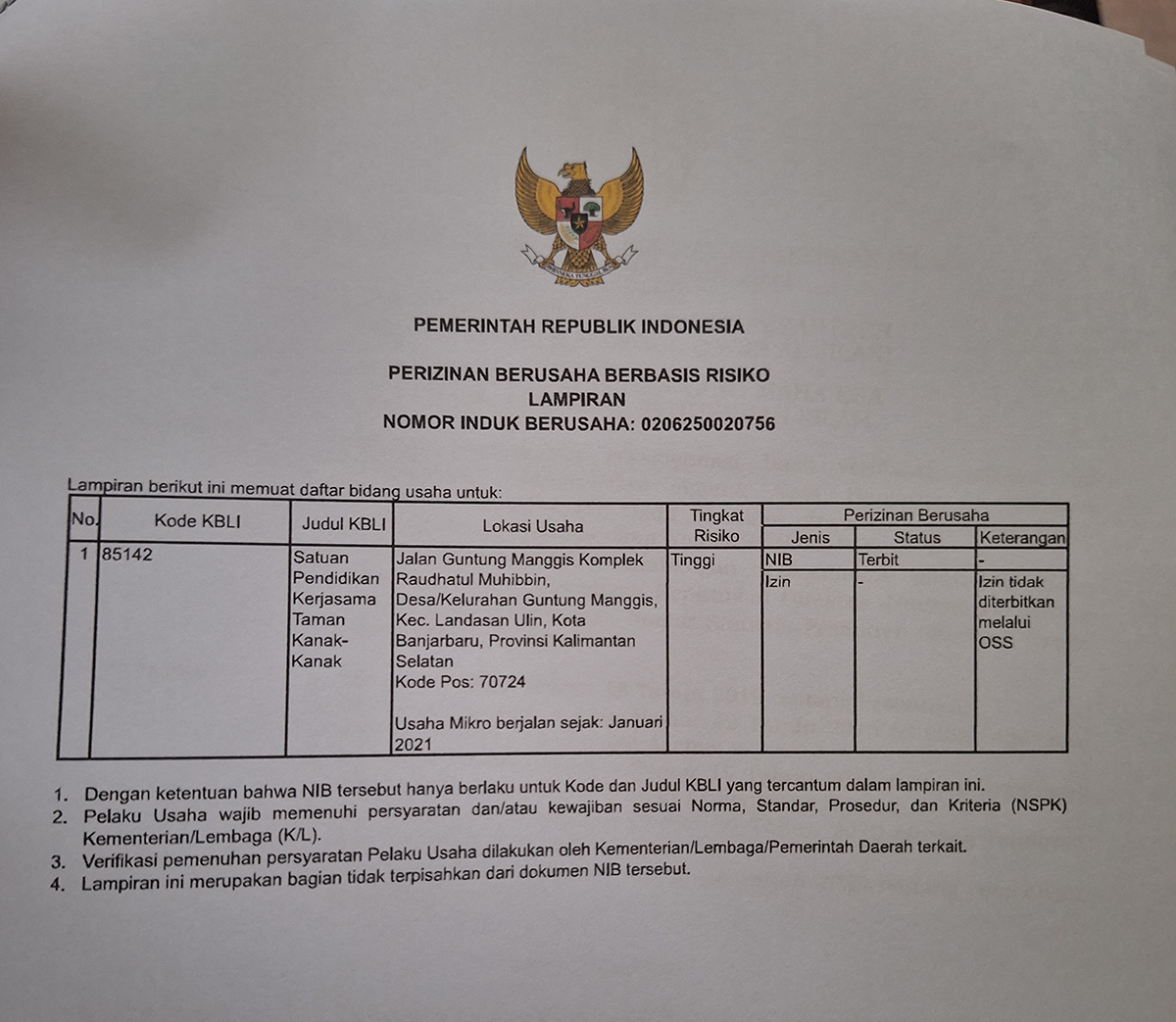 Bagian lain yang menarik dari dokumen NIB tersebut adalah bahwa pelaku usaha dengan NIB terkait dapat melakukan kegiatan berusaha sebagaimana tersebut dalam lampirannya. Untuk mereka, kegiatan usaha terlampir adalah dengan KBLI 85142 (Satuan Pendidikan Kerjasama Taman Kanak-Kanak). Perlu dicatat bahwa NIB tersebut bukan sebuah izin usaha. Izin usaha masih harus didapatkan dari institusi terkait. [ Lihat lampiran NIB📄].