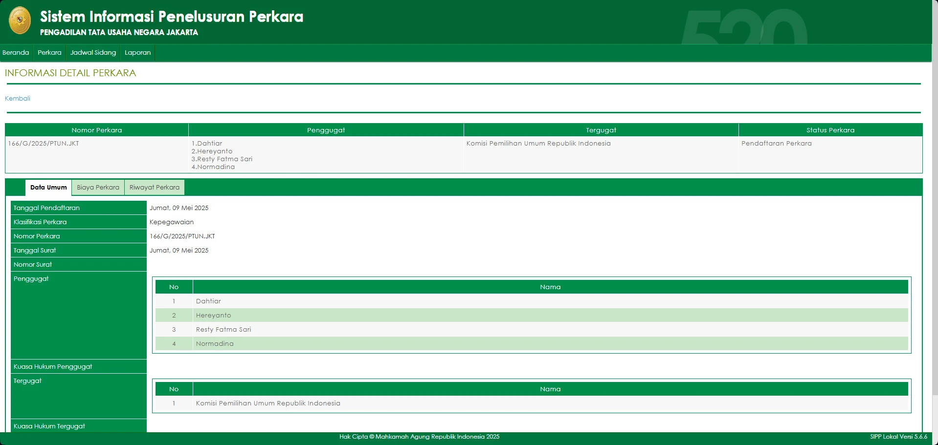 Terkini, berdasarkan hasil penelusuran informasi melalui laman Sistem Informasi Penelusuran Perkara (SIPP) Pengadilan Tata Usaha Negara (PTUN) Jakarta, didapati data perkara dengan nomor 166/G/2025/PTUN.JKT. Perkara tersebut adalah gugatan yang diajukan oleh Dahtiar, Hereyanto, Resty Fatma Sari, dan Normadina. Tergugat adalah KPU RI. (Lihat laman SIPP PTUN Jakarta)