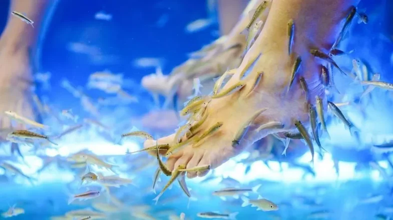 Di sanalah saya melihat itu bak air, tempat ikan-ikan kecil berenang kian kemari. Katanya bisa buat terapi macam-macam. Caranya, klien harus mencelupkan kaki sebatas betis ke itu bak air, untuk kemudian membiarkan ikan-ikan kecil itu berpesta pora mengarahkan mulutnya ke betis klien.
