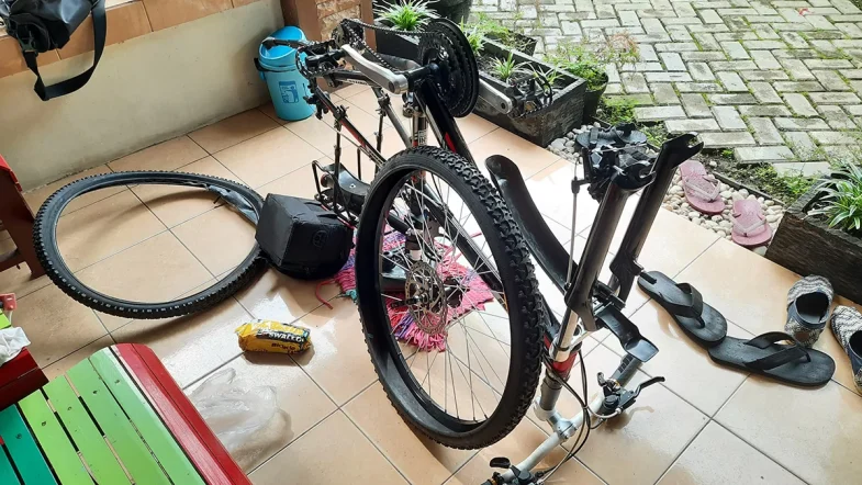 Jadilah kemudian pergi lagi membeli ban dalam. Kali ini yakin hanya membeli satu saja. Karena sepeda Mama bannya cuma dua. Begitu akan mulai mengganti ban dalam belakang, kesadaran baru muncul kembali. Sangat berbeda dengan ban belakang. Karena ban belakang ada macam-macamnya. Lebih dari itu, belum diajari oleh Warm bagaimana mengganti ban belakang.